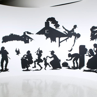 Kara Walker is a contemporary American artist who is best known for her distinct large full room installations composed of black paper cut outs. Her artwork reflects “themes of African American racial identity” with a style that balances between mural arts and traditional African illustration. Walker creates immersive spaces by the addition of light that reflects the viewer’s shadows into the piece allowing it to move, grow, and change constantly. While Walker’s artwork can be perceived was somber, she said, “I didn’t want a completely passive viewer. I wanted to make work where the viewer wouldn’t walk away.”